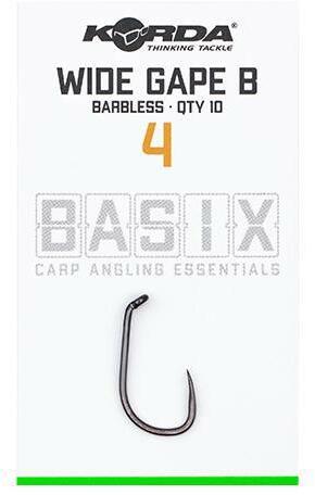 A Korda Basix Barbless Wide Gape szakáll nélküli horgot egyenesen a csomagból lehet felhasználni a legkülönfélébb szerelékekhez, anélkül, hogy sok más alkatrészt kellene hozzáadni - akár süllyedő csalinak, akár pop-up és wafter-hez is használható. Az agresszív befordított fül segít abban, hogy beforduljon és jól akadjon anélkül, hogy további Kickers-t vagy zsugorcsö