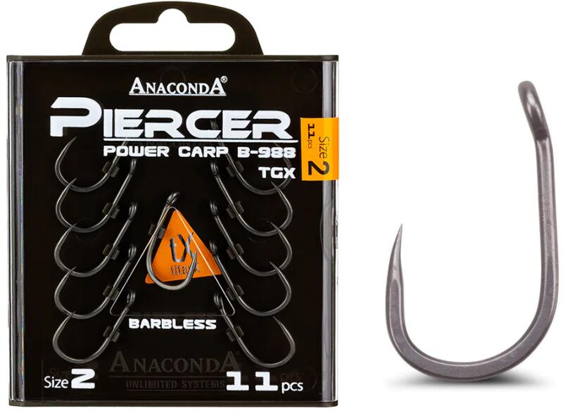 Anaconda Piercer Power Carp B-988 TGX pontyozó horog Prémium minőségű, szakáll nélküli horog a bojlis módszert kedvelő és nagyhalas feeder horgászok számára. Kompromisszum-mentes, extra erős és nagyon éles horog, mely a felsőkategóriából már jól ismert titanX alapanyagból készül. Színe matt, sötét szürke, mely a legkevésbé zavaró a kételkedő halak számára. A k