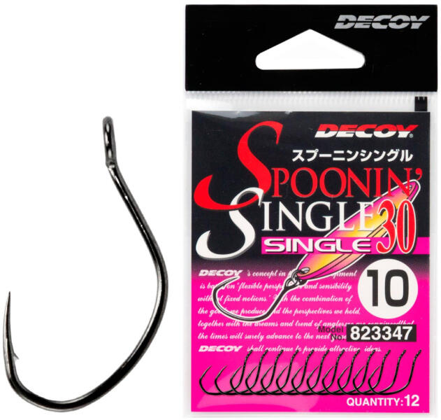 Gyártó: Decoy Modell: Single-30 Spoonin' Single Horog méret: #6 Szín: fekete Kiszerelés: 12 db/csomag Származási hely: Japán A Decoy Single-30 Spoonin' Single egy kiváló minőségű, japán gyártású horog, mely kifejezetten a pergető sporthorgászat szerelmeseinek készült. Ez a horog kiválóan alkalmas süllő, csuka, sügér és egyéb ragadozó halak fogására. A Decoy Single-3
