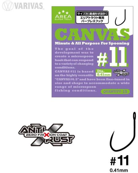 A Varivas Super Trout Area Tournament Hook Canvas egy speciális horog, a területi pisztránghorgászat abszolút bajnoka. Yudai Ito top versenyzővel együttműködve fejlesztették ki, hogy alkalmazkodjon az új csalikhoz és technikákhoz. A horgokat méret szerinti optimális alakú kialakítással tervezték, amely minden egyes méretnek egyértelmű szerepet ad, optimalizálva a horogképes