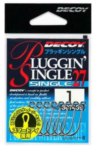 A Decoy 27 Pluggin Single horgok a legmagasabb minőségű japán horgok. A horog erős és rendkívül éles, egyedi és agresszív formájú, és nagy az átütő ereje. A horgok japán kovácsolt acélból készülnek, nikkelezett felületűek, és az elektrokémiailag élezett hegy hosszú élettartamot biztosít.