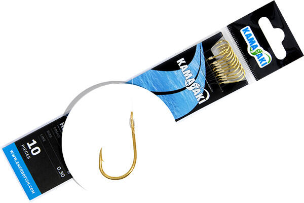 Sok esetben nagy segítséget jelentenek az előkötött horgok, amelyeket a célnak megfelelő horoggal, többféle méretben, a hozzá illő zsinórvastagsággal állítanak össze a gyártók. Ezzel az időt, jó látást és kézügyességet igénylő horogkötés feladatát átvállalják tőlünk. Itt arany színű chinu horgokat kötöttek, a horog méretének megfelelő átmérőjű 40cm-e