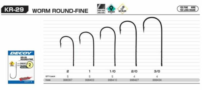 A legfejlettebb horgok közé tartozik a Decoy Worm KR29 Round Fine. A szöget, a hajlítást, a vastagságot és a horgot gondosan átgondolták és mikro pontossággal állították be, hogy a lehető legjobb eredményt érje el a halak elleni küzdelemben. A horgokat független tudományos keménységi és szilárdsági vizsgálatoknak is alávetették, és az eredmények megerősítették a ke