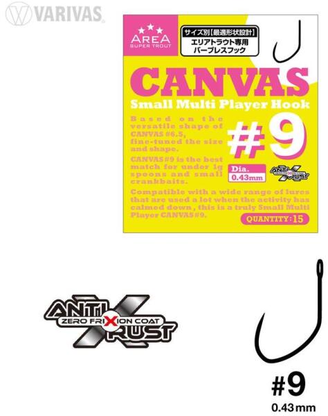 A Varivas Super Trout Area Tournament Hook Canvas egy speciális horog, a területi pisztránghorgászat abszolút bajnoka. Yudai Ito top versenyzővel együttműködve fejlesztették ki, hogy alkalmazkodjon az új csalikhoz és technikákhoz. A horgokat méret szerinti optimális alakú kialakítással tervezték, amely minden egyes méretnek egyértelmű szerepet ad, optimalizálva a horogképes