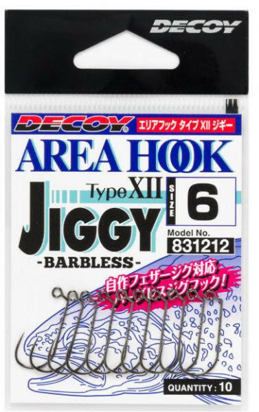 Gyártó: Decoy Modell: Area Hook type-XII AH-12 JIGGY barbless (szakáll nélküli) Horog méret: #8 Szín: fekete Kiszerelés: 10 db/csomag Származási hely: Japán A Decoy Area Hook Type-XII AH-12 JIGGY egy speciális súly nélküli jig horog, melyet plasztikcsalis Ultra Light (UL) és Light pergető horgászatra fejlesztettek. Az AH-12 JIGGY modell barbless – azaz szakáll nélküli , amin