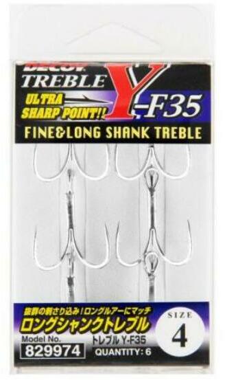 Az Y-F35 hosszú szárú hármas horog, amely a legmagasabb minőségű, hidegen kovácsolt szénacélból készül. A horgok éles hegyekkel rendelkeznek, és hosszú ideig megőrzik alakjukat és élességüket. A nikkelezett felület ideális víz alatti álcázást és korrózió elleni védelmet biztosít.
