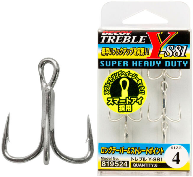 A Decoy Y-S81 Super Heavy Duty hármas horog egy kiváló japán minőségű, erős és strapabíró horog, amelyet kifejezetten nagyobb ragadozó halfajokra terveztek. Ez a hármas horog kiváló választás olyan horgászoknak, akiknek fontos a megbízhatóság és az erősség a horgászat során. A horog rozsdamentes acélból készült, ami garantálja a hosszú élettartamot és a kiváló e