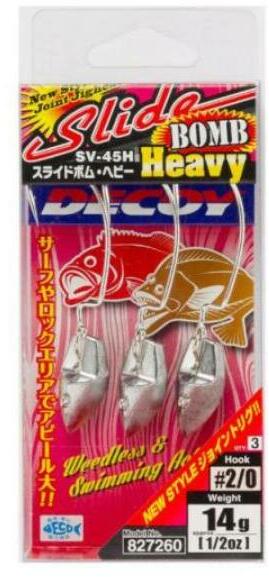 A Decoy SV-45H Slide Bomb Heavy jigeket szénacélból készült japán horgokra öntik, amelyeket egy speciális kémiai technológiával éleznek, ami garantálja a nagy átütőerővel rendelkező éles hegyet. Ez egy nagyon részletesen megtervezett jig, amely könnyen használható minden súlyhoz és mérethez. Minden egyes horgot külön-külön elektronikusan tesztelnek. Ez a jig modell a