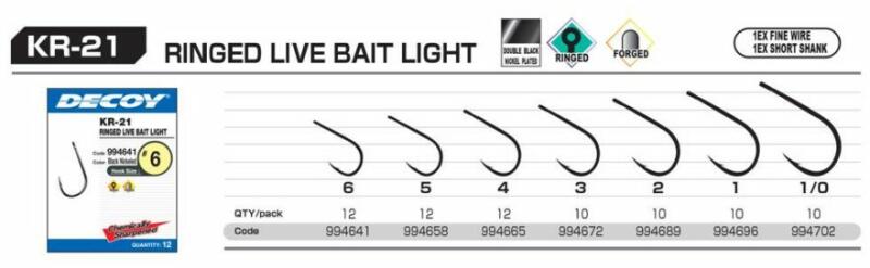 A Decoy KR-21 Round Live Bait Light prémium minőségű -Japánban készült- ragadozó horog. Ajánlott csuka élő csalival történő horgászatakor, de kerek hajlításának és vékonyságának köszönhetően kiválóan alkalmazható a horgászat különböző területein is. Vékonysága ellenére rendelkezik elegendő erővel ahhoz, hogy a nagy halak ellen is felvegye a küzdelmet. A horo