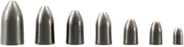 Basic weights for Texas and Carolina Rig sets made of tungsten with aerodynamic bullet shape. A rig made using them in connection with a glass bead gives predators intriguing sounds, which encourage them to attack the lure.