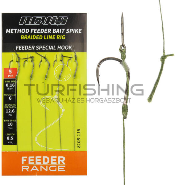 Fonott zsinórral szerelt feeder előke. Szakállas, Feeder Special horoggal, csalitüskével. Horog: 12 Tüske: 7 mm Előke hossz: 8.5 cm Előke átmérő: 0.10 mm Előke szakítószilárdság: 7.5 kg Kiszerelés: 5 db