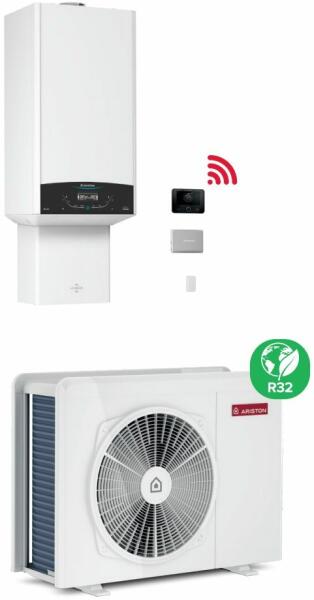 35 kW-os fali kombi kondenzációs gázkazán, 3,5 kW-os levegő/víz üzemű hőszivattyúval, Hidraulikai modul alkalmazásával, Wifi rendszerrel A GENUS ONE HYBRID NET R32 az Ariston hibrid rendszer, amely a Genus One kondenzációs kazánból, a Nimbus M Net R32 kültéri egységből és a Hybrid Module NET R32 hibrid modulból áll. Gyári hibrid rendszer hőszivattyúval és kondenzációs