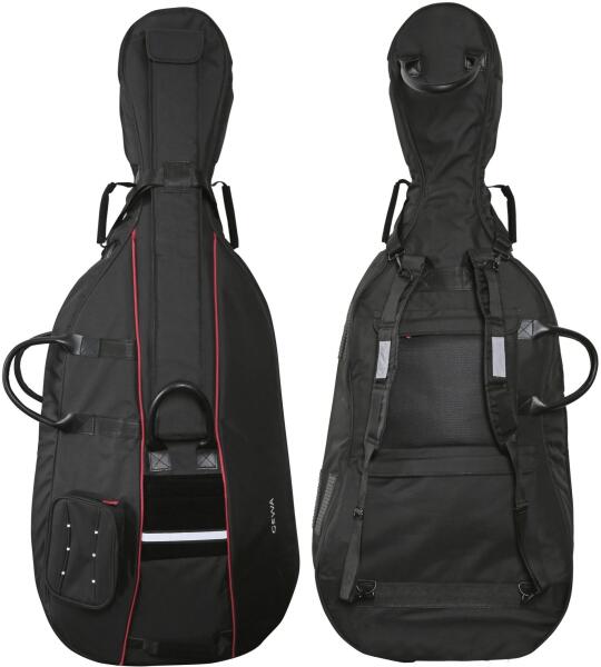 GEWA 291510 3/4 Csellótáska 25 mm-es tricot-bélés YKK cipzár Erősités a tüskénél, hidnál és fejnél Vonótáska fa héjjal megerősitve Nagy kotta- és húrzseb, extra tartozékzseb Erős varrású hátizsákpántok Fényvisszaver őcsikok elől és hátul Biztonsági pánt a tüskénél Anyag GEWA-Tex fekete Szín: fekete/píros
