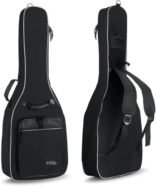akusztikus basszusgitár puhatok: DeLuxe széria, 20 mm vastag fekete szivacsos bélés, vízálló RokTex és műbőr alapanyagok, extra védőpárna a mechanikus részeknél, 2 darab 50 mm széles párnázott vállpánt heveder, párnázott hordozó fogantyú az egyik oldalon és elöl, 2 cipzáros első- és 1 nyakzseb, ablak zseb névjegykártyáknak, megerősített műanyag szélek, alsó fé