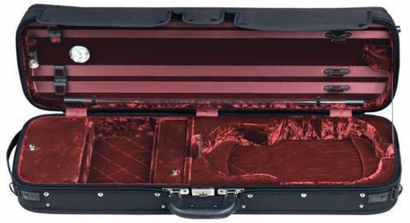 GEWA 309300 Hegedű Tok Liuteria Atlanta thermo-mag párnázott, ún. lebegő-tárolás súlya kb. 2,9 kg vízlepergető csavarozott huzat kottazsebbel GEWA vonótartó szabadalom rugalmas vonótartó híd védőhuzat tartoz krekesz bőr fogatyú 2 levehető hátizsák-pánt kívül fekete Tex belül piros plüss 4/4