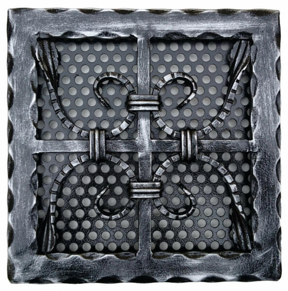 Kovácsoltvas kandalló szellőzőrács Méret: 250 x 250 mm Beépítési méret: 210 x 210 mm * (falban kivágandó méret!) Szín: fekete - ezüst antik Kézműves termék! Hőálló, korróziógátló, strapabíró szinterezett alap kiváló légáteresztéssel
