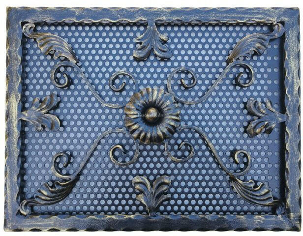 Kovácsoltvas kandalló szellőzőrács Méret: 500 x 500 mm Beépítési méret: 460 x 460 mm * (falban kivágandó méret!) Szín: fekete - arany antik Kézműves termék! Hőálló, korróziógátló, strapabíró szinterezett alap kiváló légáteresztéssel