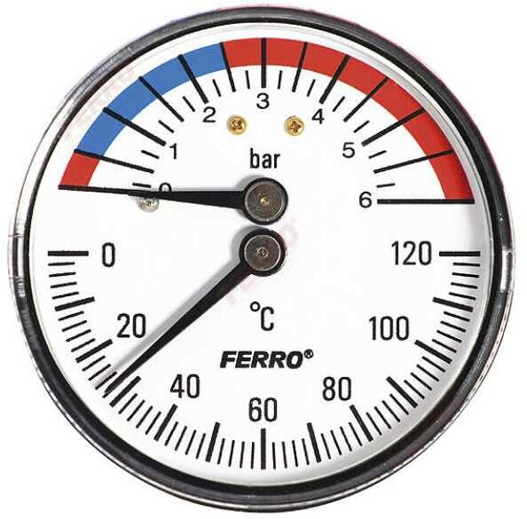 Ferro Termomanométer hátsó csatlakozású 0-120 °C, 6 bar termomanométer hátsó csatlakozású 0-120 °C, 6 bar hátsó csatlakozó 1/2 burkolat: nagy szilárdságú ABS műanyag karcálló kemény fedõlap tárcsa: porfestett alumíniumm hõmérõtartomány: 0-120 °C nyomásmérõ tartomány: 0-6 bar számlap külsõ átmérõ Ø63 mm mechanizmus: Bourdon rugós nyomásmérõ hõmérõ: bi
