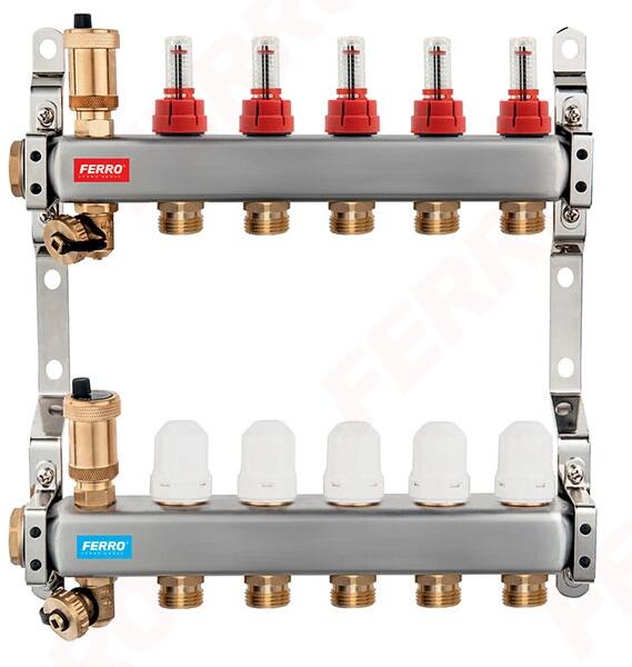 Közvetítő közeg: víz glikol 50% Garancia 15 év AISI 304 főelosztó 2 - 12 kimenettel, 2 db (1) rozsdamentes acél osztótartó készlet (2) az előremenő oldalra szerelt áramlásmérők az áramlás szabályozására (3) kézi szabályozós szelepek a visszatérő hálózaton, termofejezhető csatlakozási lehetőséggel (4) automata légtelenítő szelep G1/2"", 2 db (5) 1/2"" töltő-ü