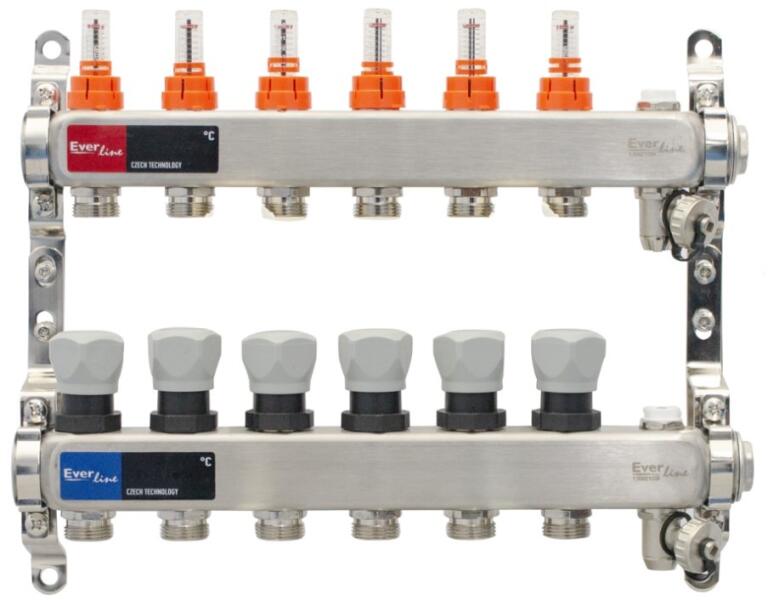 TE-SA 12 körös előszerelt osztó-gyűjtő 1-os előszerelt osztó-gyűjtő, krómozott. Alkotórészek: 1-1 db osztó és gyűjtő test, termová tehető szeleptestek kézi kerekekkel, elzáró visszatérő szelepek, felfogató idom, 3/4-os euroconus csatlakozó csonkokkal.