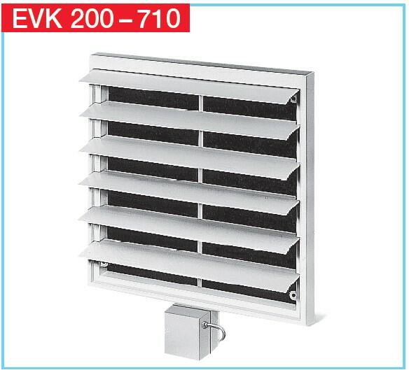 EVK 500 Levegő elszívó- és befúvónyílások lefedésére. Keretek, lamellák és állítórudak világosszürke műanyagból, állítómechanika ház IP 56-os szabadtéri szerelésre. Vezérlése automatikusan a ventilátorral együtt: váltókapcsoló kapcsolja az állítómotort ami a végálláskapcsolással a ventilátor-áramkört kapcsolja. Az állítómechanika teljesen bekötött, 1,