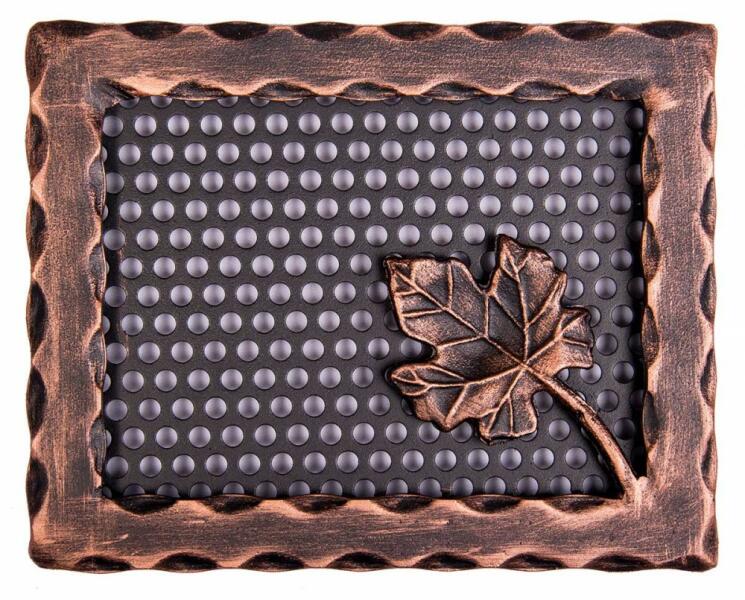 Kovácsoltvas kandalló szellőzőrács Méret: 250 x 200 mm Beépítési méret: 210 x 160 mm * (falban kivágandó méret!) Szín: fekete - réz antik Csavarozható kivitel Kézműves termék! Hőálló, korróziógátló, strapabíró szinterezett alap kiváló légáteresztéssel