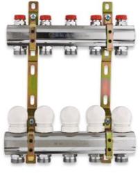 TE-SA 6 körös előszerelt osztó-gyűjtő 1-os előszerelt osztó-gyűjtő, krómozott. Alkotórészek: 1-1 db osztó és gyűjtő test, termová tehető szeleptestek kézi kerekekkel, elzáró visszatérő szelepek, felfogató idom, 3/4-os euroconus csatlakozó csonkokkal.