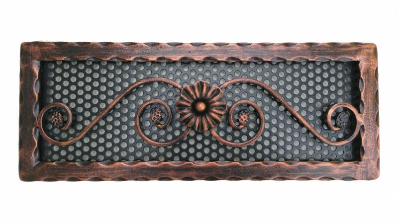 Kovácsoltvas kandalló szellőzőrács Méret: 490 x 190 mm Beépítési méret: 450 x 150 mm * (falban kivágandó méret!) Szín: fekete Kézműves termék! Hőálló, korróziógátló, strapabíró szinterezett alap kiváló légáteresztéssel