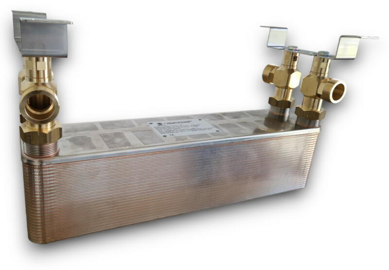 Hőcserélő tartókonzollal Hőcserélő maximális teljeítménye: 330kW Névleges teljesítmény: 60-140kW Lemezek száma: 30 Csatlakozás: 4x 1 1/4 külső menet Névleges áramlás: 22 m³/h Hőcserélő felőlet: 1,800 m2 Üzemi nyomás: 30 bar Próba nyomás: 45-60 bar Min. hőmérséklet: -190°C Max. hőmérséklet: +225°C Súly: 11 kg Lemez anyaga: rozsdamentes acél 304 vagy 316 Lemez