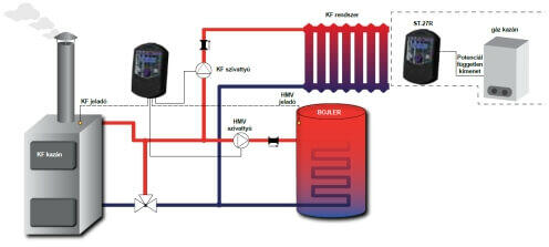 TECH HU-27 fűtés szivattyú vezérlő központi fűtés (KF) szivattyú és a rendszerben működő 2. szivattyú (beállitástól függően puffer, használati meleg víz – HMV, illetve padlófűtés - PF) munkájának vezérlésére szolgál. 1. üzem: Szivattyü vezérlő feladata elindítani a fűtési szivattyút, ha a hőmérséklet eléri a beállított bekapcsolási hőmérsékletet, m