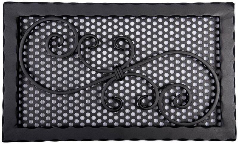 Kovácsoltvas kandalló szellőzőrács Méret: 415 x 250 mm Beépítési méret: 375 x 210 mm * (falban kivágandó méret!) Szín: fekete Kézműves termék! Hőálló, korróziógátló, strapabíró szinterezett alap kiváló légáteresztéssel