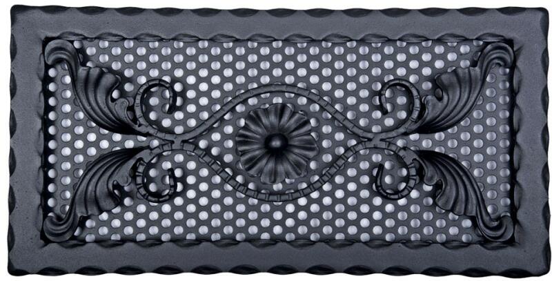 Kovácsoltvas kandalló szellőzőrács Méret: 440 x 220 mm Beépítési méret: 400 x 180 mm * (falban kivágandó méret!) Szín: fekete Csavarozható kivitel Kézműves termék! Hőálló, korróziógátló, strapabíró szinterezett alap kiváló légáteresztéssel