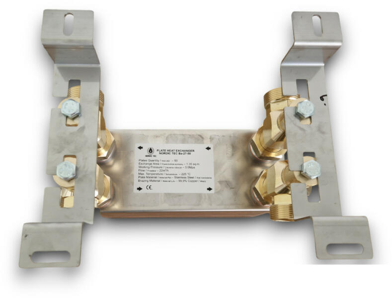 Hőcserélő tartókonzollal Hőcserélő maximális teljesítménye: 390kW Névleges teljesítmény: 65-150kW Lemezek száma: 70 Csatlakozás: 4x 1¼ külső menet Névleges áramlás: 12 m³/h Hőcserélő felület: 1,89 m2 Üzemi nyomás: 30 bar Próba nyomás: 45-60 bar Min. hőmérséklet: -190°C Max. hőmérséklet: +225°C Súly: 10,5 kg Lemez anyaga: rozsdamentes acél 304 vagy 316 Lemez