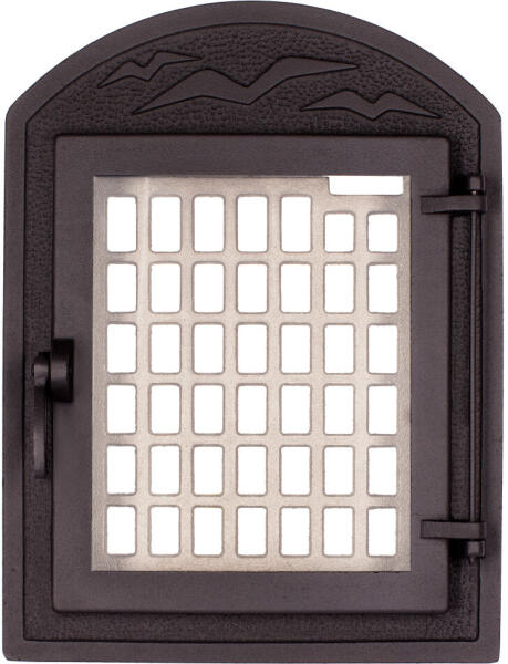 Íves Madaras nagy üveges kandalló-, cserépkályha ajtó. Öntvény ajtó, Magyar gyártó, magyar termék. Beépítési méret: 265 x 320 mm Külső méret: 345 x 460 mm Üveg méret: 235 x 290 mm Az ajtó tartozékai: - Parázsfogó ajtó - öntvény - Tűzálló üveg - Hőálló tömítőzsinór - Beépítő karmok. Felülete hőálló fekete festékkel kezelve. Ajánlott termékek az ajtó
