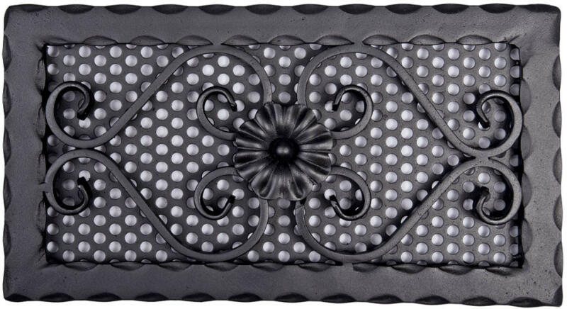 Kovácsoltvas kandalló szellőzőrács Méret: 370 x 200 mm Beépítési méret: 330 x 160 mm * (falban kivágandó méret!) Szín: fekete Kézműves termék! Hőálló, korróziógátló, strapabíró szinterezett alap kiváló légáteresztéssel