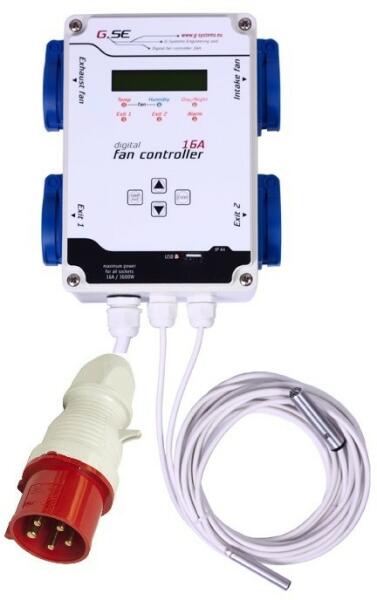A digitális ventilátorszabályozó GSE, 16A/4x2200W a hőmérséklet és a páratartalom alapos szabályozására szolgál zárt környezetben, több ventilátorral. Minden egyes aljzat maximum 2200W felvehető teljesítményt tud kezelni, a teljes felvett teljesítmény egységenként nem haladhatja meg a 3600W-ot. Négy gombbal vezérelhető, jól látható kijelzővel és figyelmeztető LED-e