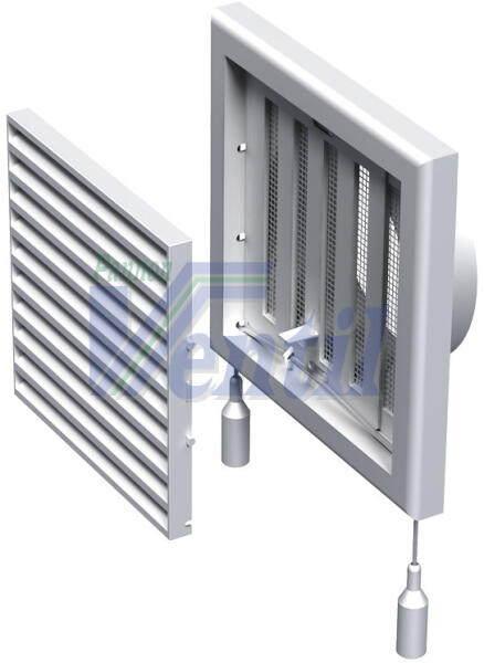 Műanyag takaróelem lakossági, közületi vagy ipari szellőzőrendszerek be- és elszívónyílásainak lezárására. Fehér szín, négyszögletes kialakítás. Szabályozható zsaluval. Szúnyoghálóval. 100 mm átmérő csőcsatlakozás. 154x154 mm. Anyag: Műanyag Átmérő [mm]: 100 Forma: Négyszög Szabályozható: igen