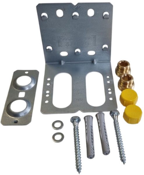 Vogel&Noot szögelem szett 3/4" Szögelem szett összekötő kengyellel Jobbos, balos és középcsatlakozású szelepes lapradiátorokhoz Vakolt falra alkalmazható Hosszú élettartam Kiváló minőség A csomag tartalma: Horganyzot t hatlapfejű csavar (8x70 Műanyagtipli (10x60) Horganyzott alátét (Ø8,4) Műanyag zárókupak (G 1/2) Adapter (1/2-3/4) A kép csupán illusztráció!
