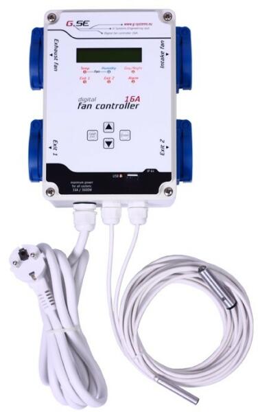 A digitális ventilátorszabályozó GSE, 16A/4x2200W a hőmérséklet és a páratartalom alapos szabályozására szolgál zárt környezetben, több ventilátorral. Minden egyes aljzat maximum 2200W felvehető teljesítményt tud kezelni, a teljes felvett teljesítmény egységenként nem haladhatja meg a 3600W-ot. Négy gombbal vezérelhető, jól látható kijelzővel és figyelmeztető LED-e