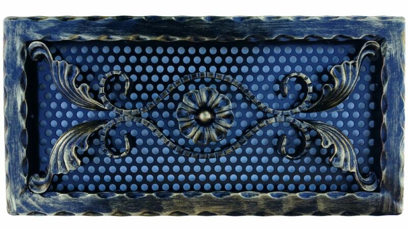 Kovácsoltvas kandalló szellőzőrács Méret: 440 x 220 mm Beépítési méret: 400 x 180 mm * (falban kivágandó méret!) Szín: fekete - arany antik Csavarozható kivitel Kézműves termék! Hőálló, korróziógátló, strapabíró szinterezett alap kiváló légáteresztéssel