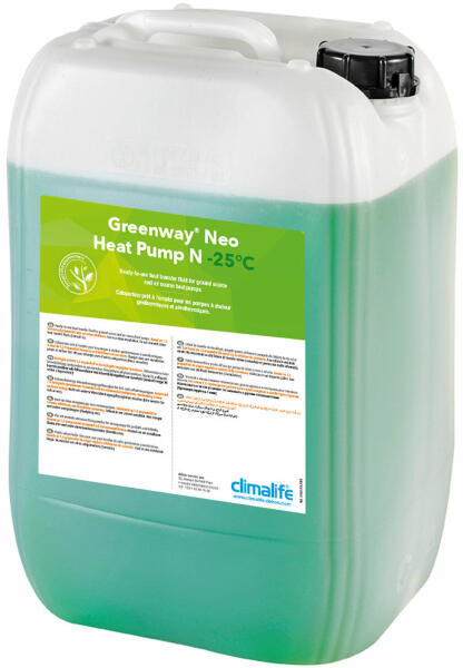 Climalife Greenway Neo Heat Pump N-25 adalékanyag Geotermikus levegő-vizes aerotermikus hőszivattyús rendszerekhez közvetítőközeg Hatékony hibrid inhibitorokat tartalmaz Környezetkímélő anyagból készült Bakteriosztatikus tulajdonságú Fagy elleni védelmet biztosít Gátolja az iszapképződést Kiváló minőségű termék A kép csupán illusztráció! Műszaki adatok Kiszerelé