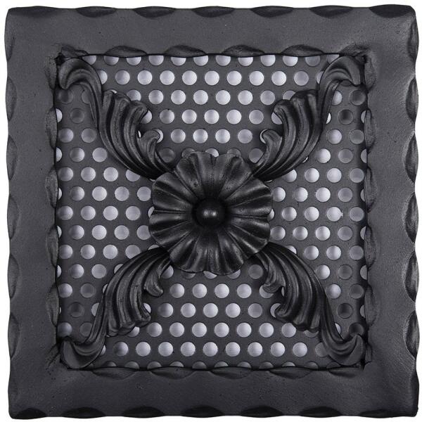 Kovácsoltvas kandalló szellőzőrács Méret: 220 x 220 mm Beépítési méret: 180 x 180 mm * (falban kivágandó méret!) Szín: fekete Csavarozható kivitel Kézműves termék! Hőálló, korróziógátló, strapabíró szinterezett alap kiváló légáteresztéssel