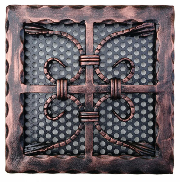 Kovácsoltvas kandalló szellőzőrács Méret: 250 x 250 mm Beépítési méret: 210 x 210 mm * (falban kivágandó méret!) Szín: fekete - réz antik Csavarozható kivitel Kézműves termék! Hőálló, korróziógátló, strapabíró szinterezett alap kiváló légáteresztéssel