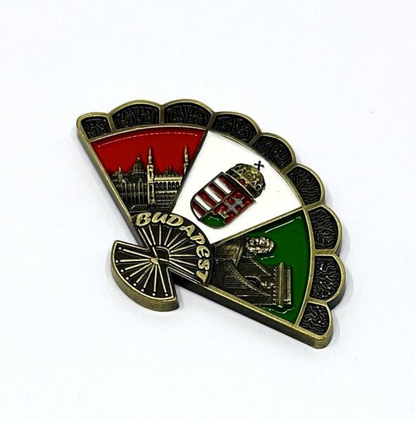 Legyező formájú, Budapest feliratú hűtőmágnes, Lánchíd, Parlament és címer motívummal. Kedves meglepetés külföldi rokonaink, ismerőseink, barátaink számára. Anyaga: fém Mérete: kb. : 7 x 4,5 cm