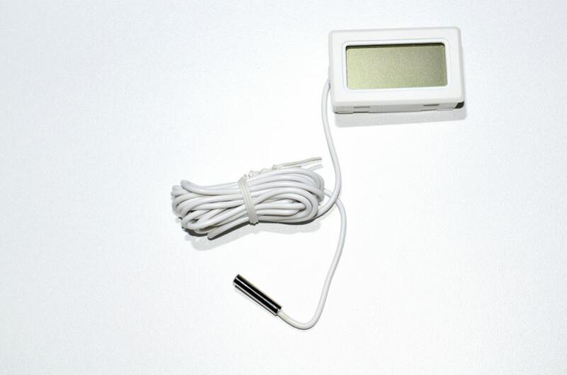 elemet tartalmaz (2db - LR44-et) Technical description: Thermometer 26x44mm. Hole: 26x58mm. Probe with polycarbonate cable: 1500mm. Temperature range: -50°C +70°C. Color: white. With batteries.