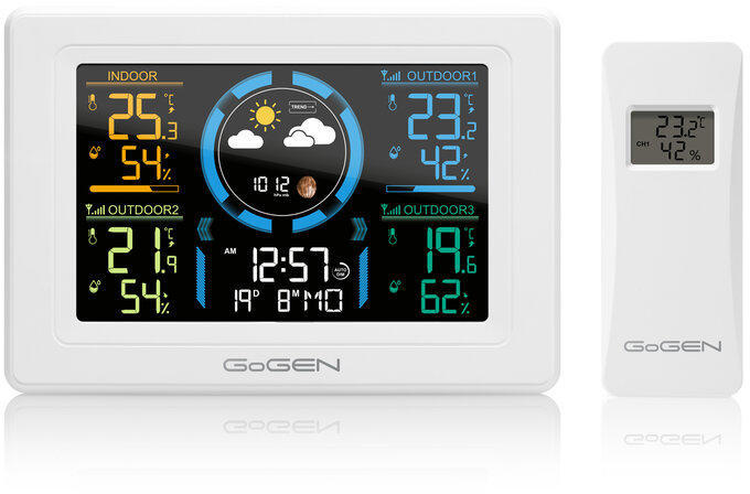 Gogen IDŐJÁRÁS ÁLLOMÁS ME 3397 W FUNKCIÓ Színes LCD kijelző Állítható kijelző háttérvilágítás intenzitása DCF 77 rádiójel által vezérelt idő Három vezeték nélküli érzékelő a csomagban (MESSENZOR97) Légköri nyomás - abszolút Időjárás előrejelzés Beltéri hőmérséklet és páratartalom Külső hőmérséklet és páratartalom Max és Min hőmérséklet és p
