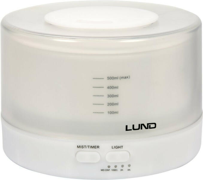 LUND távirányítós ultrahangos aromadiffúzor, párásító funkcióval. 12 W teljesítmény, 500 ml-es tartály, 10 óra üzemidő. 2 féle párásító funkció, 2 féle üzemmód, időzítő, 40-60 ml/h hatékonysággal akár 50 m2-es helyiségbe is alkalmas. LED lámpa, 7 világítási szín, automatikus kikapcsolás, csendes működés. AC hálózati adapter, vízmérő pohár és távirá