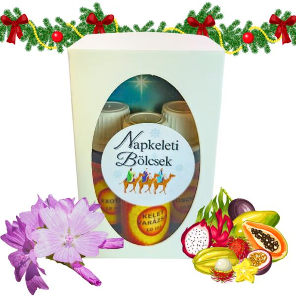 "Napkeleti bölcsek" aromaterápiás illóolaj szett 3 x 10 mlMOSCHUS illóolaj:Erőteljes, kellemes illat, amelyet általában földesnek vagy fás illatnak érzünk. Felejthetetlen, mély és érzéki illata békés, meleg hangulatot teremt, segítve a pihentető alvást, miközben egy csipetnyi misztikumot is csempész az estébe. KELET VARÁZSA illóolaj:Ez az illóolaj-keverék az ünnepi nyu