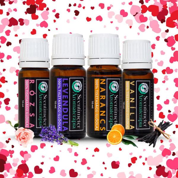 A 4 Darabos Aromaterápiás Valentin Napi Illóolaj Csomagban megtalálható illóolajok: - 1db Levendula Illóolaj - 1db Narancs Illóolaj - 1db Rózsa Illóolaj - 1db Vanília Illóolaj
