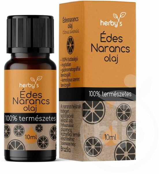 Herbys édesnarancs illóolaj 10 ml A herby’s Édesnarancs olaj 100% természetes, hígítatlan illóolaj. Brazíliában készül, a narancs héjának hidegen sajtolásával. Az általunk forgalmazott illóolajok minden gyártási tételre vonatkozóan rendelkeznek gázkromatográfiás- és tömegspektrometriás vizsgálattal. A beszállítói dokumentációink tartalmazzák az olajok kivonási